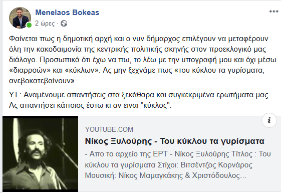 Φαίνεται πως η Δημοτική Αρχή και ο νυν Δήμαρχος επιλέγουν να μεταφέρουν όλη την κακοδαιμονία της κεντρικής πολιτικής σκηνής στον προεκλογικό μας διάλογο. Προσωπικά ό,τι έχω να πω, το λέω με την υπογραφή μου και όχι μέσω «διαρροών» και «κύκλων». Ας μην ξεχνάμε πως «του κύκλου τα γυρίσματα, ανεβοκατεβαίνουν».