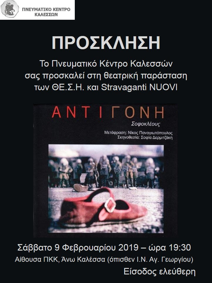 Το Πνευματικό Κέντρο Καλεσσών προσκαλεί όλους τους θεατρόφιλους το Σάββατο 9 Φεβρουαρίου και ώρα 19:30 στα Καλέσσα για τη θεατρική παράσταση των Θ.Ε.Σ.Η. και Stravaganti NUOVI “ΑΝΤΙΓΟΝΗ” Σοφοκλέους, σε σκηνοθεσία της Σοφίας Δερμιτζάκη.