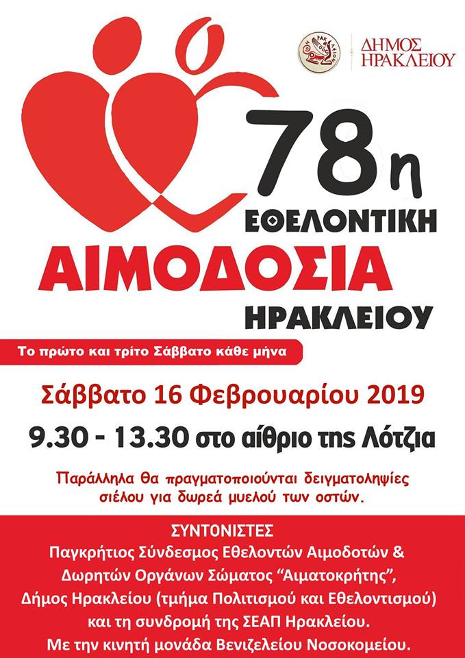 Εθελοντική Αιμοδοσία θα πραγματοποιηθεί το Σάββατο 16.02.2019 στο κέντρο της πόλης του Ηρακλείου (στο Αίθριο της Λότζια), και ώρες 10:00 – 13:30. Πρόκειται για μια κοινή προσπάθεια αιμοδοσίας, την οποία συντονίζουν:
