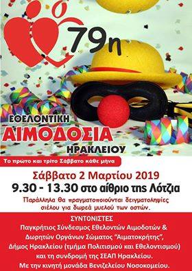 Εθελοντική Αιμοδοσία θα πραγματοποιηθεί το Σάββατο 2.03.2019 στο κέντρο της πόλης του Ηρακλείου (στο Αίθριο της Λότζια), και ώρες 9:30 – 13.30. Πρόκειται για μια κοινή προσπάθεια αιμοδοσίας, την οποία συντονίζουν: