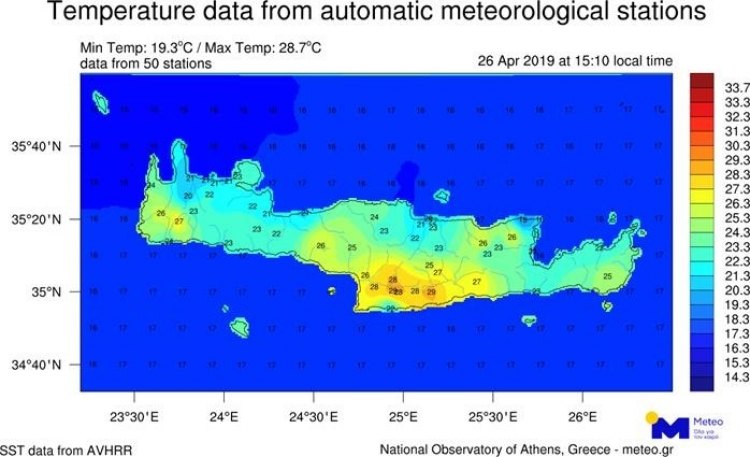 Στον χάρτη φαίνονται οι μέγιστες θερμοκρασίες της ημέρας, όπως καταγράφηκαν από το σύνολο των 50 σταθμών του Εθνικού Αστεροσκοπείου/meteo.gr στην Κρήτη.