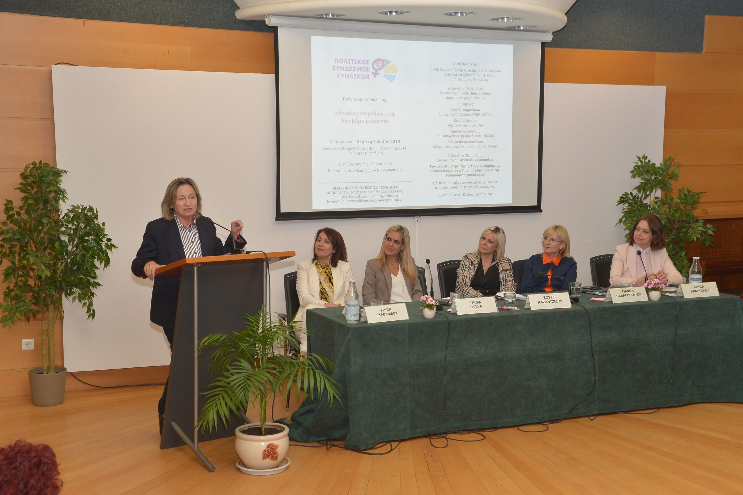 Βασικές ομιλήτριες της εκδήλωσης ήταν η Πρόεδρος του Πολιτικού Συνδέσμου Γυναικών και υποψήφια Δήμαρχος Ηρακλείου, κ. Ευαγγελία Σχοιναράκη – Ηλιάκη, η διοικητική υπάλληλος του ΑΤΕΙΘ, κ. Χρύσα Γκαβανίδου, η δημοσιογράφος της ΕΡΤ3, κ. Σύνθια Σάπικα, η πρώην βουλευτής του ΠΑΣΟΚ και δημοσιογράφος κ. Χρύσα Αράπογλου και η πρώην αντιπρόεδρος Δικηγορικού Συλλόγου Θεσσαλονίκης κ. Γιάννα Παναγοπούλου, με συντονίστρια τη δημοσιογράφο του Alpha, κ. Σούζυ Καζαντζίδου.