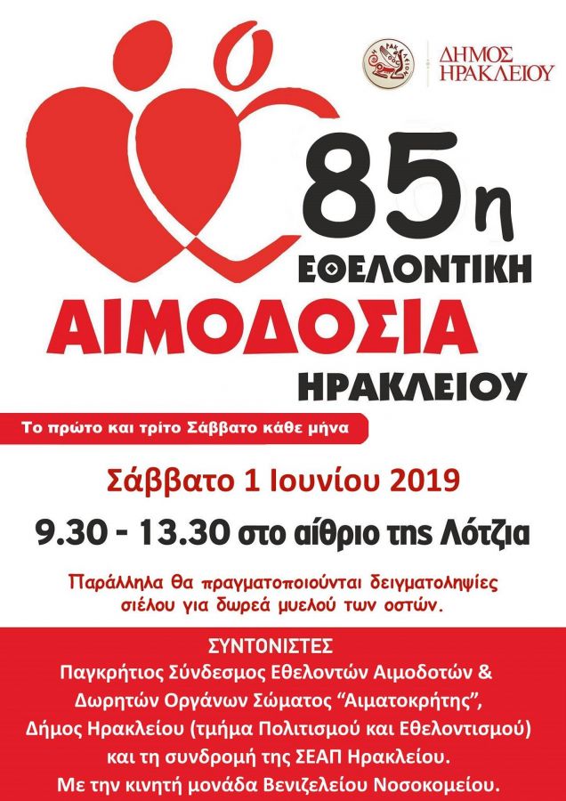 Εθελοντική Αιμοδοσία θα πραγματοποιηθεί το Σάββατο 01.06.2019 στο κέντρο της πόλης του Ηρακλείου (στο Αίθριο της Λότζια), και ώρες 10:00 – 13:30. Πρόκειται για μια κοινή προσπάθεια αιμοδοσίας, την οποία συντονίζουν:
