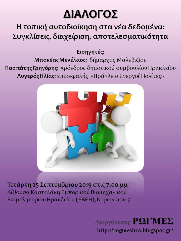 Ο ιστότοπος «ΡΩΓΜΕΣ» http://rogmeshra.blogspot.com/ χώρος ιδεών διαλόγου και δράσης, οργανώνει εκδήλωση-συζήτηση την Τετάρτη 25 Σεπτεμβρίου 2019 στις 7.00 μμ, στο Εμπορικό Βιομηχανικό Επιμελητήριο Ηρακλείου (Ε.Β.Ε.Η., αίθουσα Καστελάκη), Κωροναίου 9, με θέμα: