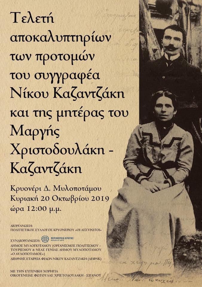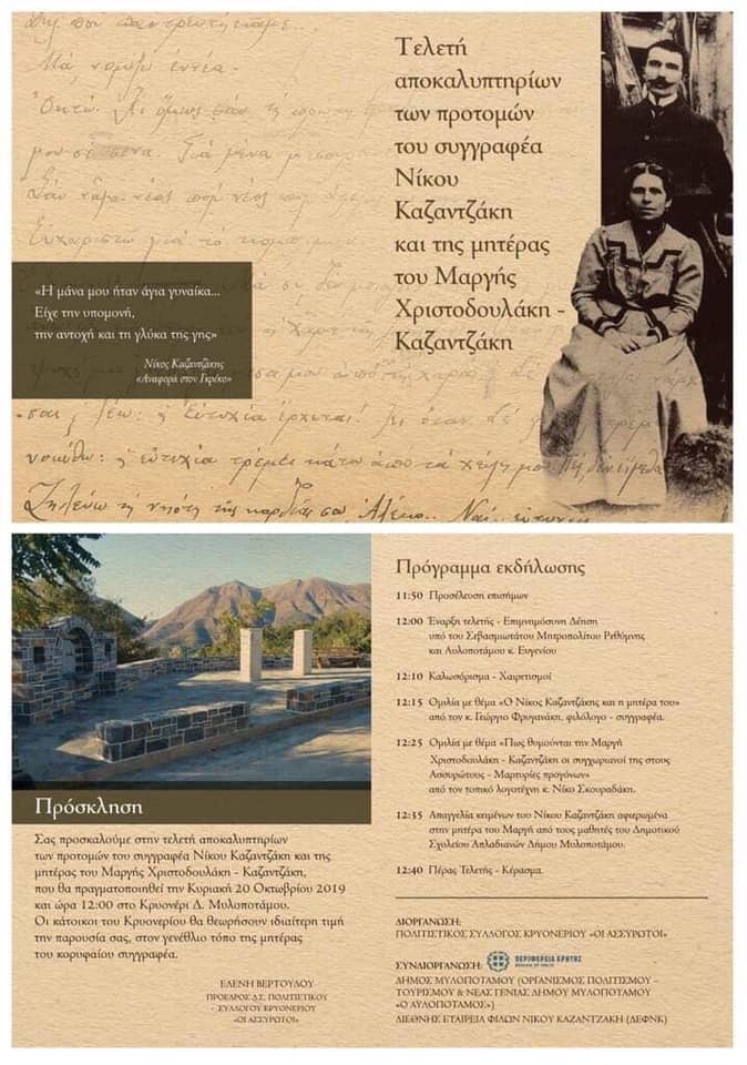 Στον τόπο καταγωγής του Νίκου Καζαντζάκη από την πλευρά της μητέρας του, στο Κρυονέρι Μυλοποτάμου, όπου έζησε και μέρος από τα παιδικά του χρόνια, θα πραγματοποιηθεί την Κυριακή 20 Οκτωβρίου 2019 και ώρα 12:00 η τελετή αποκαλυπτηρίων των προτομών του σπουδαίου συγγραφέα και της μητέρας του Μαργής Χριστοδουλάκη – Καζαντζάκη.