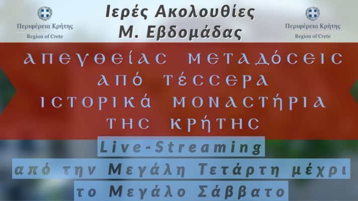 Σε συνεννόηση με την Ιερά Αρχιεπισκοπή Κρήτης και Ιερές Μητροπόλεις θα μεταδοθούν μέσω Live-Streaming  σε όλη την Κρήτη, την Ελλάδα και τον κόσμο, από την Μεγάλη Τετάρτη και μέχρι το Μεγάλο Σάββατο, οι Ιερές Ακολουθίες του Νιπτήρος, της Σταύρωσης, του Επιταφίου και της Ανάστασης.