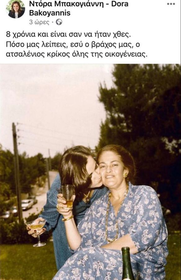 Share FacebookTwitter «Πόσο μας λείπεις, εσύ ο βράχος μας, ο ατσαλένιος κρίκος όλης της οικογένειας» έγραψε χαρακτηριστικά. ΝΤΟΡΑ ΜΠΑΚΟΓΙΑΝΝΗ Share FacebookTwitter