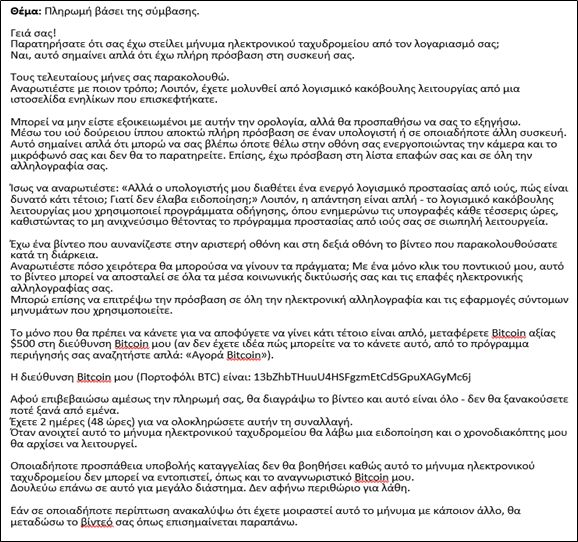 Σημειώνεται ότι τα εκβιαστικά αυτά μηνύματα ηλεκτρονικού ταχυδρομείου έχουν κυρίως τις παρακάτω μορφές και περιεχόμενο, ενώ η αναφορά σε πραγματικούς κωδικούς γίνεται ώστε οι χρήστες να πεισθούν για το αληθινό της απειλής.