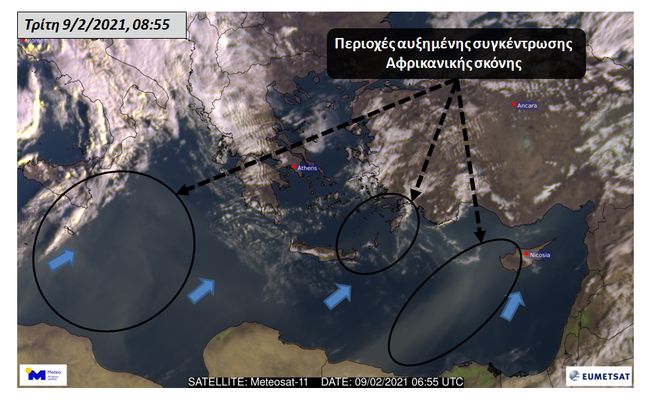 Η νοτιοδυτική ροή αερίων μαζών που επικρατεί στη Μεσόγειο έχει έως ως αποτέλεσμα την εκτεταμένη μεταφορά σκόνης από την Αφρική.