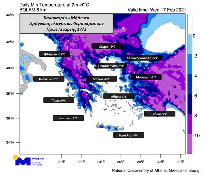 Στον χάρτη παρουσιάζονται οι περιοχές όπου η ελάχιστη θερμοκρασία που αναμένεται σήμερα το πρωί θα πέσει κάτω από μηδέν βαθμούς Κελσίου καθώς και οι ελάχιστες θερμοκρασίες για επιλεγμένες πόλεις της χώρας. Είναι εντυπωσιακό ότι στο σύνολο σχεδόν της ηπειρωτικής χώρας αλλά και σε σημαντικό μέρος της νησιωτικής θα σημειωθούν αρνητικές θερμοκρασίες.
