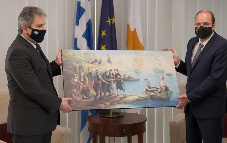 τίγραφο του ιστορικού πίνακα του Γιώργου Μαυρογένη: «Το 1821 και η Κύπρος – Κανάρης» παραχώρησε ο υπουργός Άμυνας της Κύπρου Χαράλαμπος Πετρίδης στον πρέσβη της Ελλάδας στην Κύπρο Θεοχάρη Λαλάκο, τον οποίο υποδέχθηκε με αφορμή την επέτειο των 200 ετών από την έναρξη της Ελληνικής Επανάστασης.