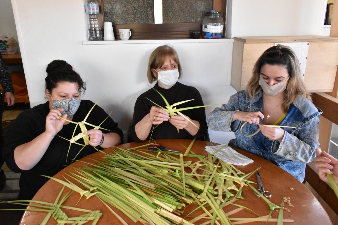 Μέρες πριν είχαν κόψει τα “βάγια”, φύλλα από φοίνικες που αφού τα έκοψαν ένα ένα κατά μήκος, ξεκίνησαν τα σταυρουδάκια που θα δοθούν στους πιστούς.