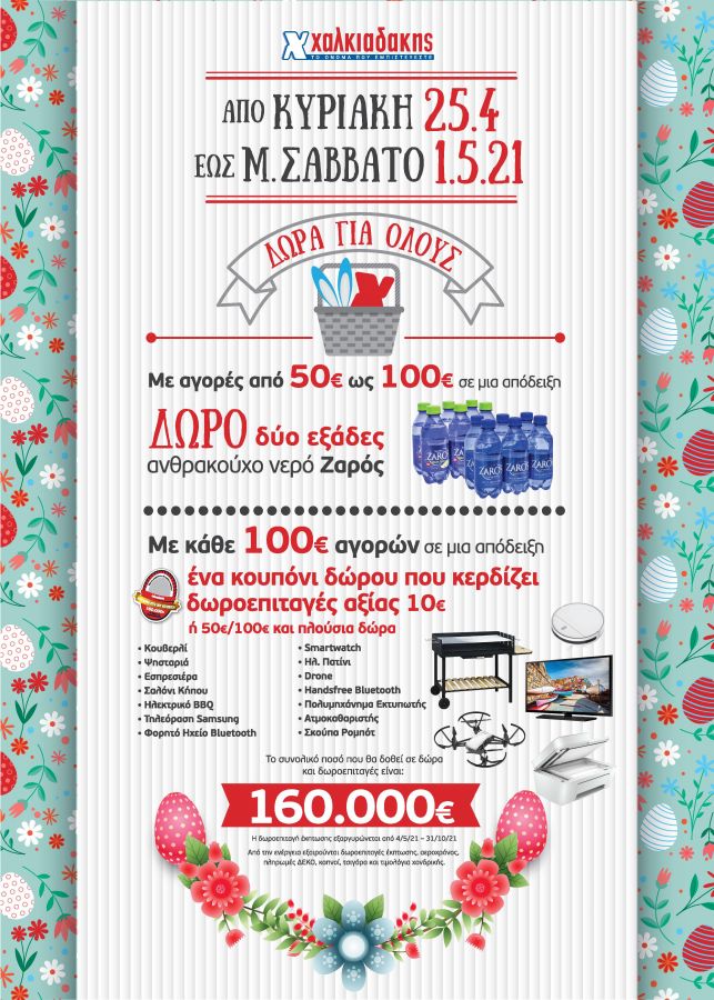 Παράλληλα, όπως κάθε Πάσχα, τα σούπερ μάρκετ Χαλκιαδάκης έχουν φροντίσει να προσφέρουν πολλά δώρα και δωροεπιταγές στους επισκέπτες τους. Ειδικότερα, μέχρι και το Μεγάλο Σάββατο 1 Μαΐου, με αγορές αξίας από 50 έως 100 € σε μια απόδειξη, όλοι παίρνουν δώρο δυο εξάδες ανθρακούχο νερό Ζαρός. Ενώ με κάθε 100 € αγορών σε μια απόδειξη, όλοι κερδίζουν δωροεπιταγή αξίας 10, 50 ή 100 € ή απίθανα δώρα, όπως drone, σαλόνι κήπου, ψησταριά, smartwatch, σκούπα ρομπότ, ηλεκτρικό πατίνι, τηλεόραση Samsung, κ.α. Δώρα αξίας για όλους!