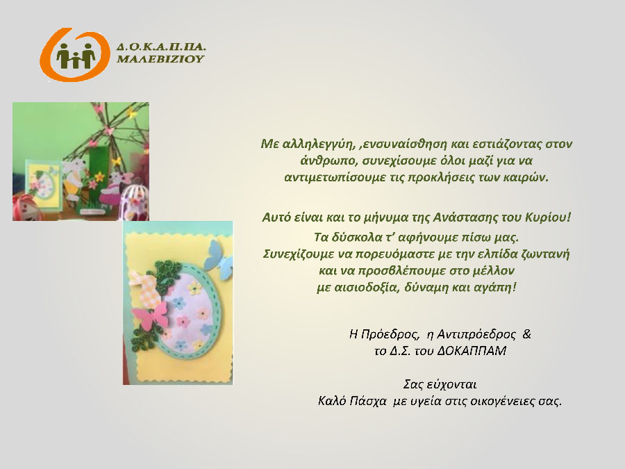 Όπως αναφέρουν στο Πασχαλινό ευχετήριο μήνυμά τους, η Πρόεδρος του ΔΟΚΑΠΠΑΜ κυρία Μαρίνα Βογιατζή και το Δ.Σ.,