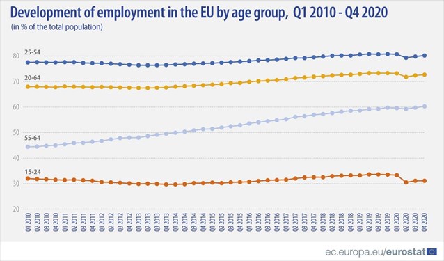 Να σημειωθεί ότι το 2019, το ποσοστό ανεργίας των ατόμων ηλικίας 15-74 στην ΕΕ είχε σημειώσει ιστορικό χαμηλό από το 2000. Ωστόσο, το ποσοστό ανεργίας αυξήθηκε κατά 0,4 ποσοστιαίες μονάδες το 2020 σε σύγκριση με το 2019, καθώς η αγορά εργασίας επηρεάστηκε σε μεγάλο βαθμό από την πανδημία.