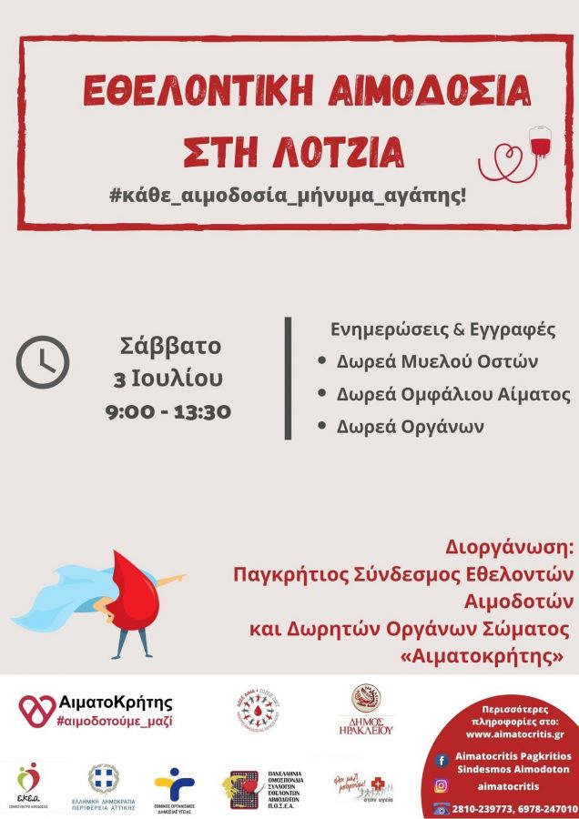 Εθελοντική Αιμοδοσίαθα πραγματοποιηθεί το Σάββατο 03.07.2021 στο κέντρο της πόλης του Ηρακλείου (στο Αίθριο της Λότζια),  από τις 09:00 έως τις 13:30.  Πρόκειται για μια κοινή προσπάθεια αιμοδοσίας, την οποία συντονίζουν: