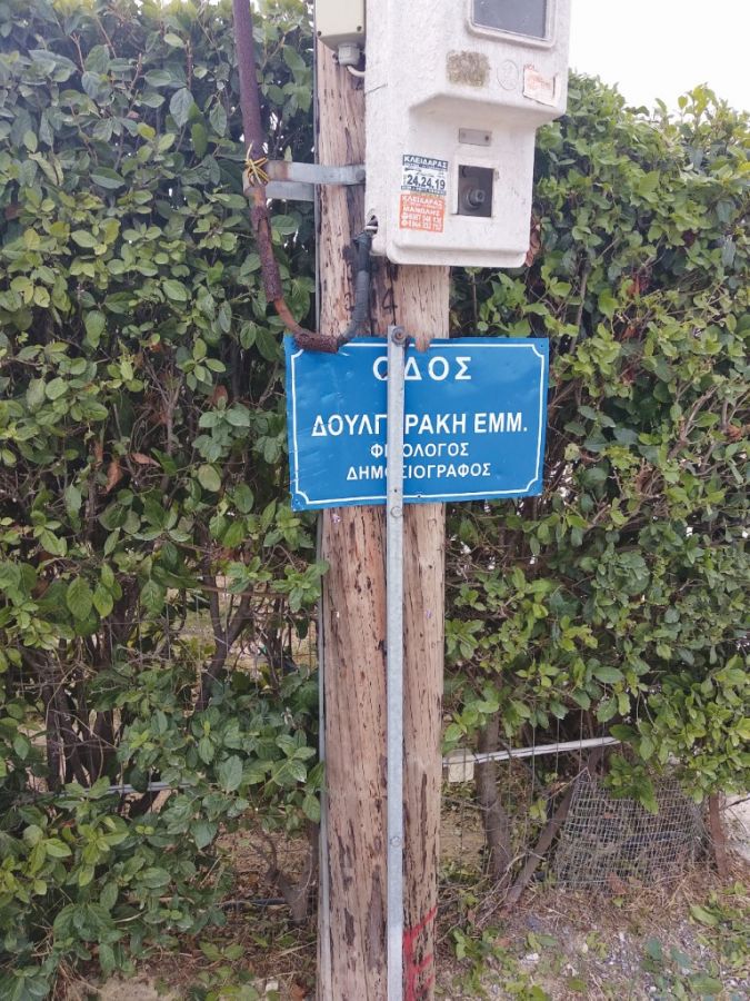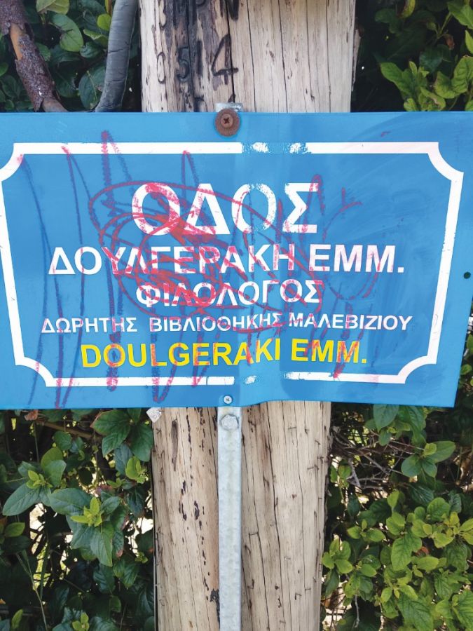 Σε μια πραγματικά δυσάρεστη έκπληξη που προκαλεί πολλά ερωτηματικά αλλά κυρίως αδερφικό πόνο βρέθηκε προ περίπου δύο μηνών ο αδερφός του αείμνηστου Μανόλη Δουλγεράκη, Μιχάλης, όταν επισκεπτόμενος την οδό που φέρει το όνομα του εκλιπόντα είδε ότι οι δυο πινακίδες ονοματοθεσίας έχουν βανδαλιστεί.