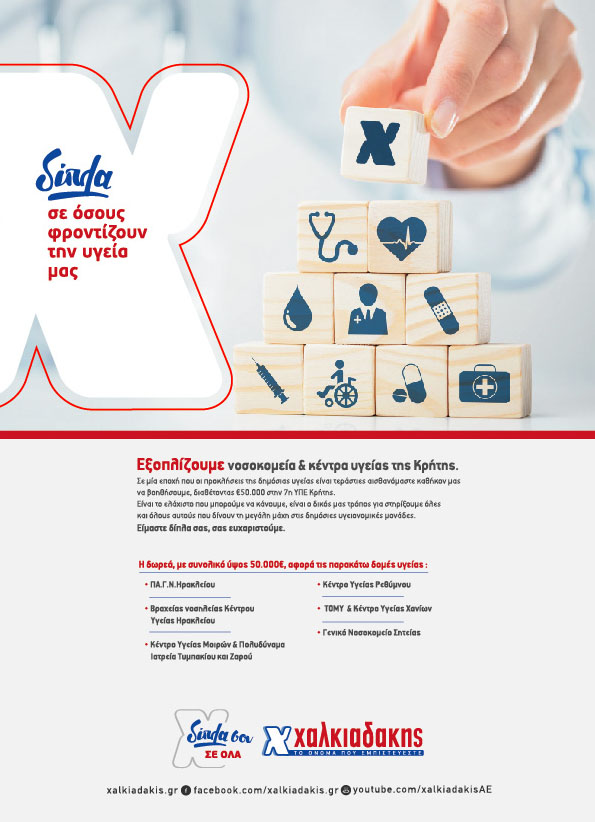 Η μεγάλη δράση δωρεάς ιατρικού και τεχνολογικού εξοπλισμού στις Δομές Υγείας της Κρήτης από την Χαλκιαδάκης Α.Ε., μια δωρεά συνολικού ύψους50.000 ευρώ, ολοκληρώθηκε με επιτυχία. Η δράση, η οποία εντάσσεται στο πλάνο Εταιρικής Κοινωνικής Ευθύνης της Χαλκιαδάκης Α.Ε. και υλοποιείται με τη συνεργασία της 7ηςΥγειονομικής Περιφέρειας Κρήτης, έχει ως στόχο να ενισχύσει την προσπάθεια που καταβάλλεται από το υγειονομικό προσωπικό στις Δομές του τόπου μας και να καλύψει βασικές ανάγκες, όπου αυτές εντοπίζονται.