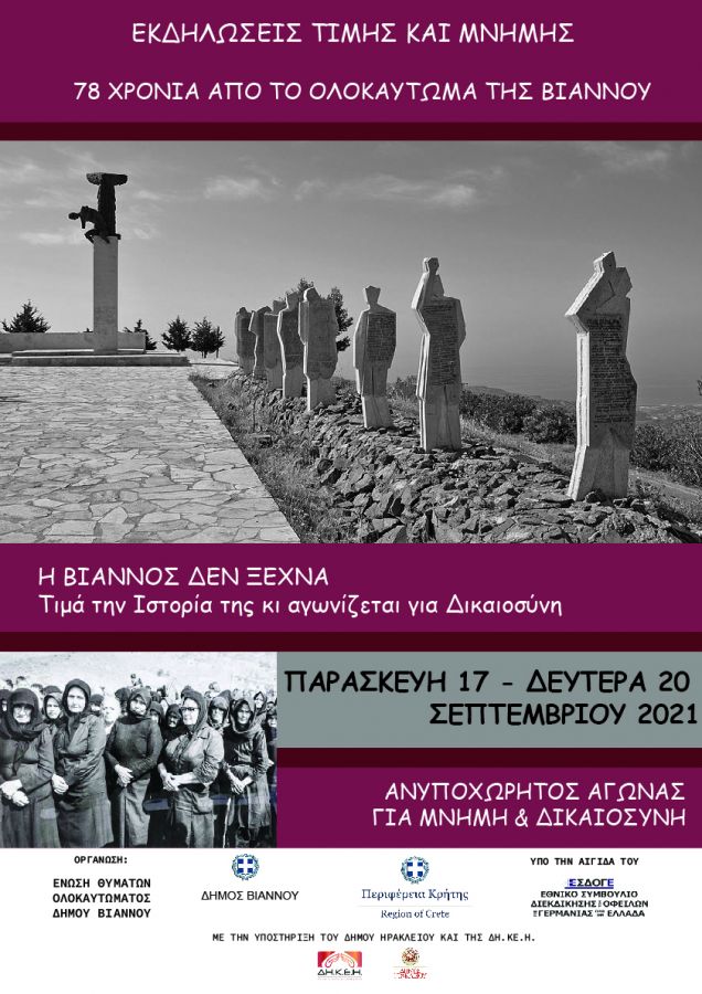 Για να τιμήσουμε τη μνήμη των νεκρών μας και να διατρανώσουμε την αποφασιστικότητά μας για τη διεκδίκηση των γερμανικών οφειλών, η Ένωση Θυμάτων Ολοκαυτώματος Δήμου Βιάννου, ο Δήμος Βιάννου και η Περιφέρεια Κρήτης, υπό την αιγίδα του Εθνικού Συμβουλίου Διεκδίκησης των Οφειλών της Γερμανίας προς την Ελλάδα, οργανώνουν εκδηλώσεις στη Βιάννο, το Ηράκλειο και την Αθήνα.