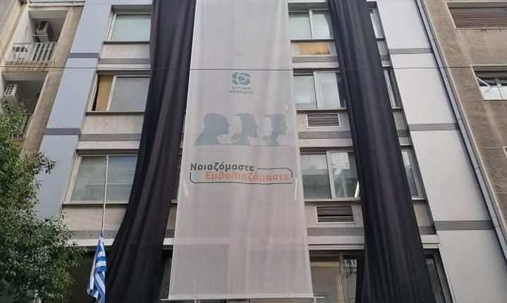 Η ελληνική σημαία κυματίζει μεσίστια στα γραφεία του ΚΙΝΑΛ από νωρίς το μεσημέρι της Δευτέρας, ενώ ένα μαύρο πανί μήκους δέκα μέτρων καλύπτει μία πλευρά της πρόσοψης του κτιρίου, σε ένδειξη πένθους.