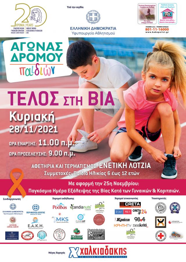 -28 Νοεμβρίου, ημέρα Κυριακή και ώρα 11:00π.μ.: Αγώνας δρόμου παιδιών ηλικίας 6-12 ετών, από το Σύνδεσμο Γυναικών και Γυναικείων Σωματείων Ηρακλείου και Ν. Ηρακλείου, με το σύνθημα «ΤΕΛΟΣ στη ΒΙΑ».