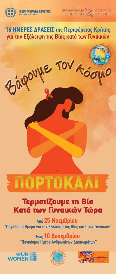 Η Περιφέρεια Κρήτης-Περιφερειακή Επιτροπή Ισότητας των Φύλων Κρήτης(ΠΕΠΙΣ Κρήτης), συμπορευόμενοι με την Παγκόσμια Εκστρατεία του Οργανισμού Ηνωμένων Εθνών για το 2021, σχεδιάζουν και υλοποιούν, για δεύτερη χρονιά,16ήμερη εκστρατεία δράσεων, με σκοπό την ενίσχυση της επίγνωσης και της ευαισθητοποίησης των πολιτών, την πρόληψη, την καταπολέμηση της έμφυλης βίας, της ενδοοικογενειακής κακοποίησης, αλλά και την κινητοποίηση των γυναικών θυμάτων βίας και τρίτων προσώπων σχετικά με την άμεση καταγγελία περιστατικών βίας. Το μήνυμα της φετινής εκστρατείας είναι «Βάφουμε τον Κόσμο Πορτοκαλί. Τερματίζουμε τη Βία κατά των Γυναικών ΤΩΡΑ». Η εκστρατεία αυτή ξεκινάει αύριο,Πέμπτη 25 Νοεμβρίου,με αφορμή τον εορτασμό της «Παγκόσμιας Ημέρας για την Εξάλειψη της Βίας κατά των Γυναικών» και θα ολοκληρωθεί την Παρασκευή, 10 Δεκεμβρίου, «Παγκόσμια Ημέρα Ανθρωπίνων Δικαιωμάτων».