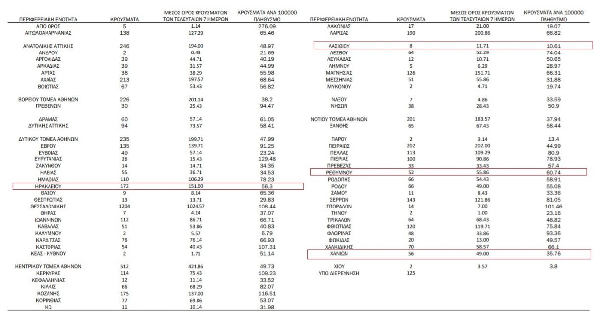 288 είναι τα νέα κρούσματα που διαγνώστηκαν, το τελευταίο 24ωρο, στην Κρήτη: 172 στην Π.Ε. Ηρακλείου, 8 στην Π.Ε. Λασιθίου, 52 στην Π.Ε. Ρεθύμνου και 56 στην Π.Ε. Χανίων.
