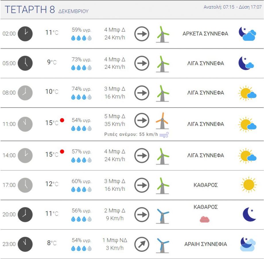 Την Τετάρτη προβλέπεται μικρή βελτίωση του καιρού ως προς την ηλιοφάνεια, όχι ως προς τη θερμοκρασία. Η θερμοκρασία θα παραμείνει σε χαμηλά επίπεδα με την υψηλότερη να είναι οι 15 βαθμοί κελσίου, ενώ πτώση θερμοκρασίας σημειώνεται τις πρωινές και τις βραδινές ώρες όπου θα πέσει στους 8 βαθμούς κελσίου. Ο άνεμος μετατοπίζεται δυτικά εντάσεως 3-5 μποφόρ με τις ριπές ανέμου να φθάνουν τα 55 km/h προς το μεσημέρι, ενώ από τις 23:00 το βράδυ θα γυρίσει ξανά σε νοτιά κάνοντας την επόμενη μέρα δύσκολη.