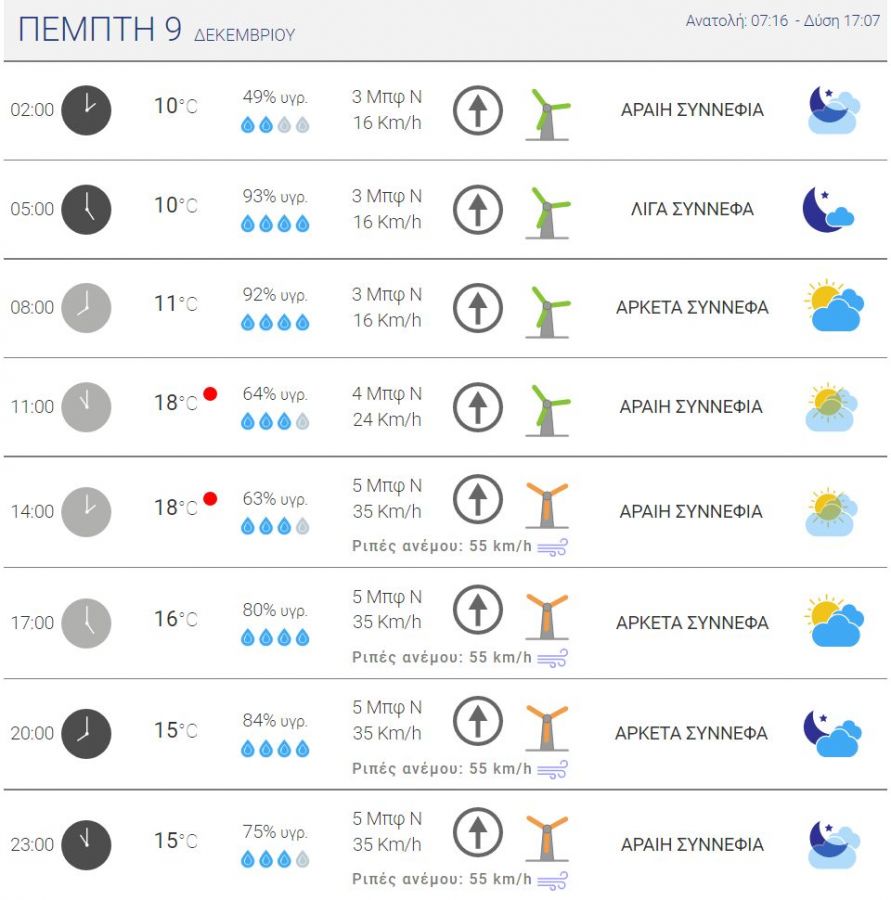 Για τη Πέμπτη, η επιστροφή του νοτιά φέρνει αρκετή συννεφιά με υψηλότερη θερμοκρασία που θα φτάσει και τους 18 βαθμούς κελσίου και η χαμηλότερη στους 15 αργά το βράδυ. Όμως από το μεσημέρι μέχρι και το βράδυ ο νότιος άνεμος θα έχει ένταση 5 μποφόρ με τις ριπές στα 55 km/h