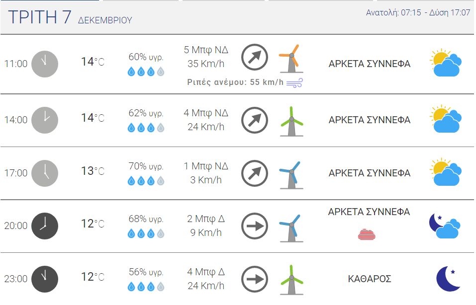 Με καταιγίδα τα ξημερώματα της Τρίτης και με βροχή ξεκίνησε η μέρα. Έτσι αναμένεται να συνεχιστεί κατά τις πρωινές ώρες έως και το μεσημέρι, καθώς στην πορεία της ημέρας θα υπάρξει συννεφιά με δυνατούς ανέμους. Οι άνεμοι θα νότιοι νοτιοδυτικοί εντάσεως έως και 5 μποφόρ, με ριπές ανέμου έως τα 55 km/h. Η θερμοκρασία δεν θα ξεπεράσει του 14 βαθμούς κελσίου, με τη χαμηλότερη να καταγράφεται με 12 βαθμούς αργά το βράδυ.