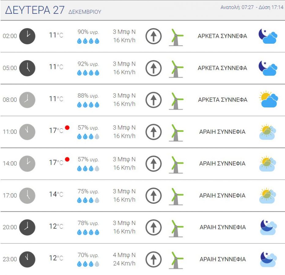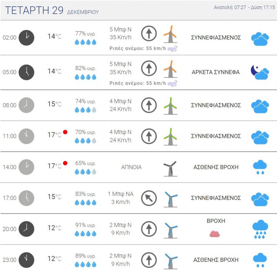 Τα ξημερώματα της Τετάρτης, ο νοτιάς θα φθάσει τα 5 μποφόρ με ριπές ανέμου έως και τα 55km/h, ενώ σταδιακά προς θα αρχίσει να εξασθενεί, καταλήγοντας το μεσημέρι σε άπνοια, μετατοπίζοντας μετά τους ανέμους Νοτιοανατολικά, εντάσεως 1-2 μποφόρ. Τα αρκετά σύννεφα της Τετάρτης, αυξάνουν και την πιθανότητα ασθενούς βροχής από το μεσημέρι και έπειτα