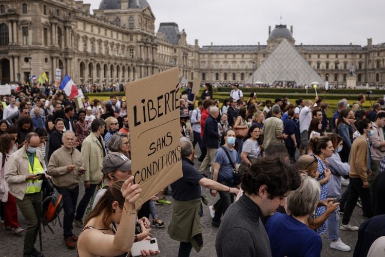 Άλλοι κρατούσαν πανό που έγραφαν «Όχι στο εμβολιαστικό πάσο», μια αναφορά στο νομοσχέδιο που προωθεί η κυβέρνηση Μακρόν βάσει του οποίου για να εισέλθει κάποιος στους περισσότερους δημόσιους χώρους θα πρέπει να επιδεικνύει πιστοποιητικό εμβολιασμού κατά της Covid-19.