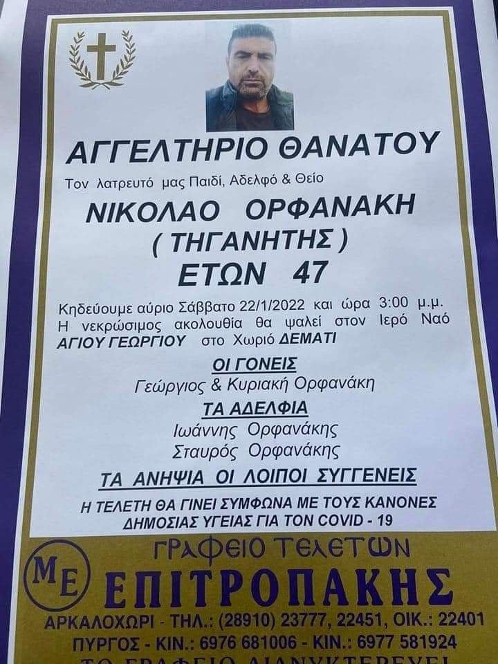 Η κηδεία του θα γίνει αύριο Σάββατο 22 Ιανουαρίου και ώρα 3μ.μ. στο Δεμάτι.
