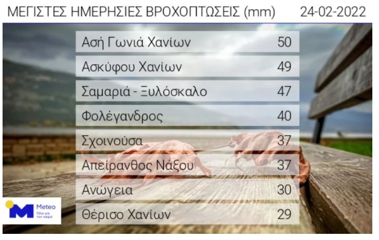 Σύμφωνα με τις καταγραφές των μετεωρολογικών σταθμών του Εθνικού Αστεροσκοπείου Αθηνών, τα ύψη των βροχοπτώσεων που εκδηλώθηκαν μέχρι το πρωί της Τσινοπέμπτης (24/02) στην Κρήτη ήταν σημαντικά. Tο μεγαλύτερο ύψος βροχόπτωσης καταγράφεται στην Ασή Γωνιά Χανίων και φτάνει τα 50 χιλιοστά. Ακολουθούν οι περιοχές Ασκύφου με 49 χιλιοστά, η Σαμαριά με 47, τα Ανώγεια με 30 και ο Θέρισος Χανίων με 29.
