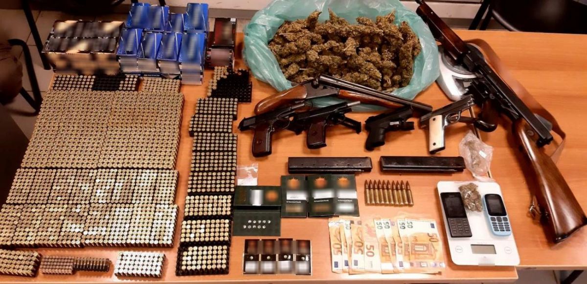 Συνελήφθησαν ένας 31χρονος, ένας 49χρονος και ένας 46χρονος, και σύμφωνα με τις πληροφορίες εντοπίστηκαν ποσότητες κάνναβης, όπλα και σφαίρες.