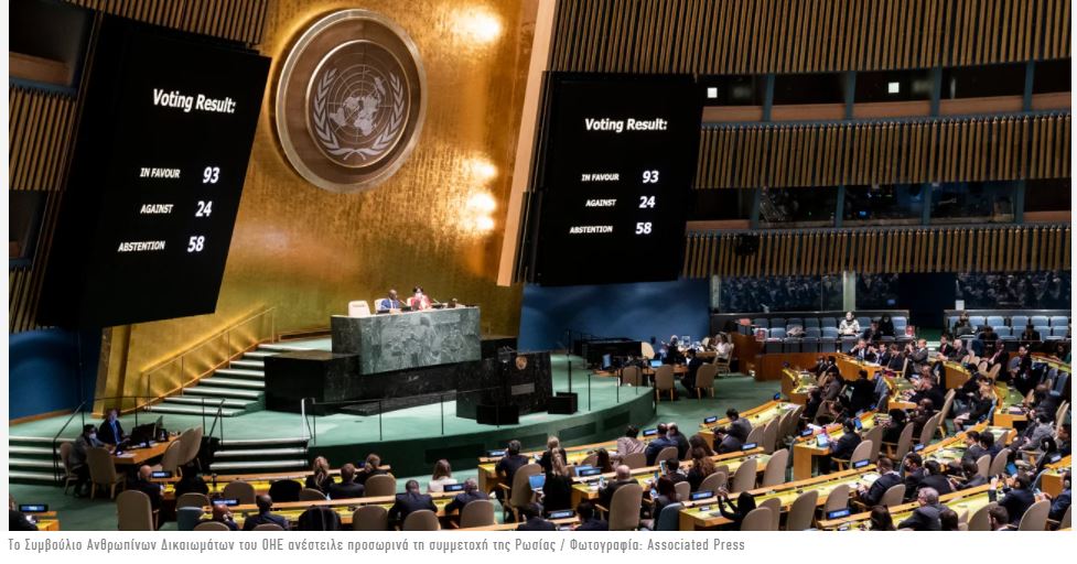 Ουσιαστικά, η Γενική Συνέλευση του ΟΗΕ ενέκρινε ψήφισμα που αποκλείει τη Ρωσία από την κορυφαία οργάνωση ανθρωπίνων δικαιωμάτων του παγκόσμιου οργανισμού.