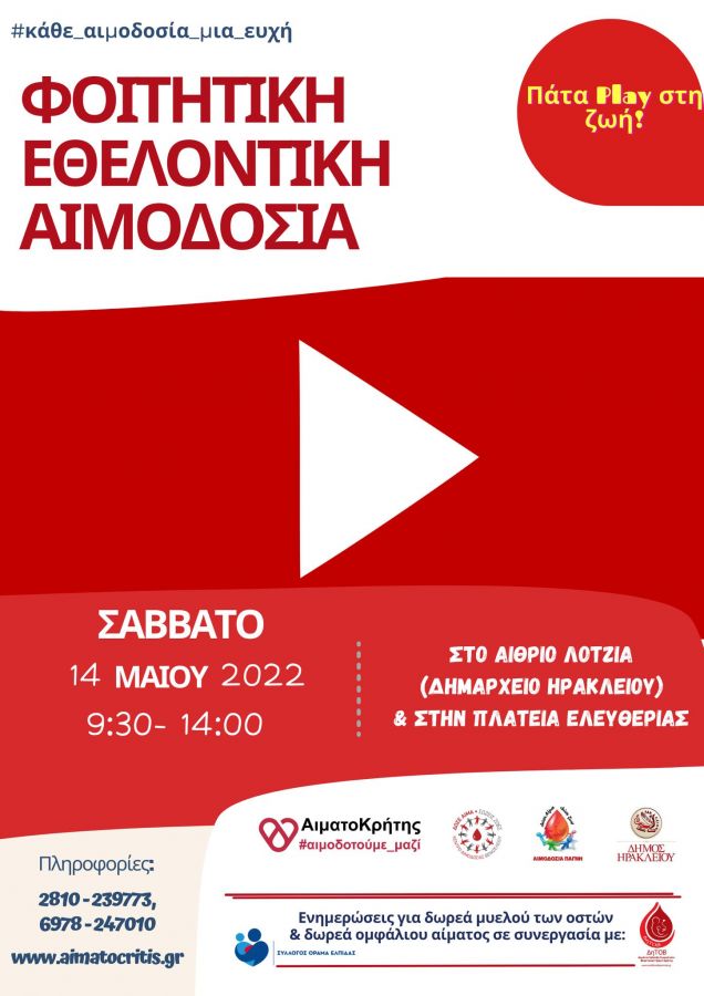 Πρόκειται για μια κοινή προσπάθεια αιμοδοσίας, την οποία διοργανώνει  ο Παγκρήτιος Σύνδεσμος Εθελοντών Αιμοδοτών και Δωρητών Οργάνων Σώματος «Αιματοκρήτης» σε συνεργασία με τον Δήμο Ηρακλείου και  την Αντιδημαρχία  Πολιτισμού – Εθελοντισμού.