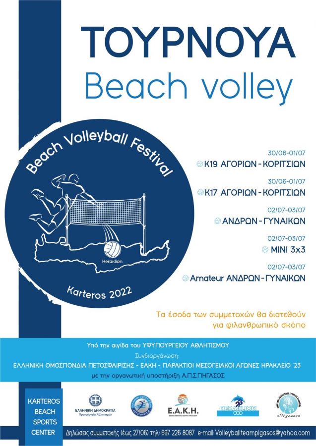 Το εναρκτήριο σερβίς θα γίνει την Πέμπτη 30 Ιουνίου και η κορύφωση θα είναι την Κυριακή 3 Ιουλίου. Πρόκειται για το 1ο φεστιβάλ μπιτς βόλεϊ που θα συνδιοργανωθεί από τον Α.Π.Σ.Πήγασο Ηρακλείου, την Ελληνική Ομοσπονδία Πετοσφαίρισης, το ΕΑΚΗ και τους Παράκτιους Μεσογειακούς Αγώνες Ηράκλειο 2023 με την την αιγίδα του υφυπουργείου αθλητισμού.