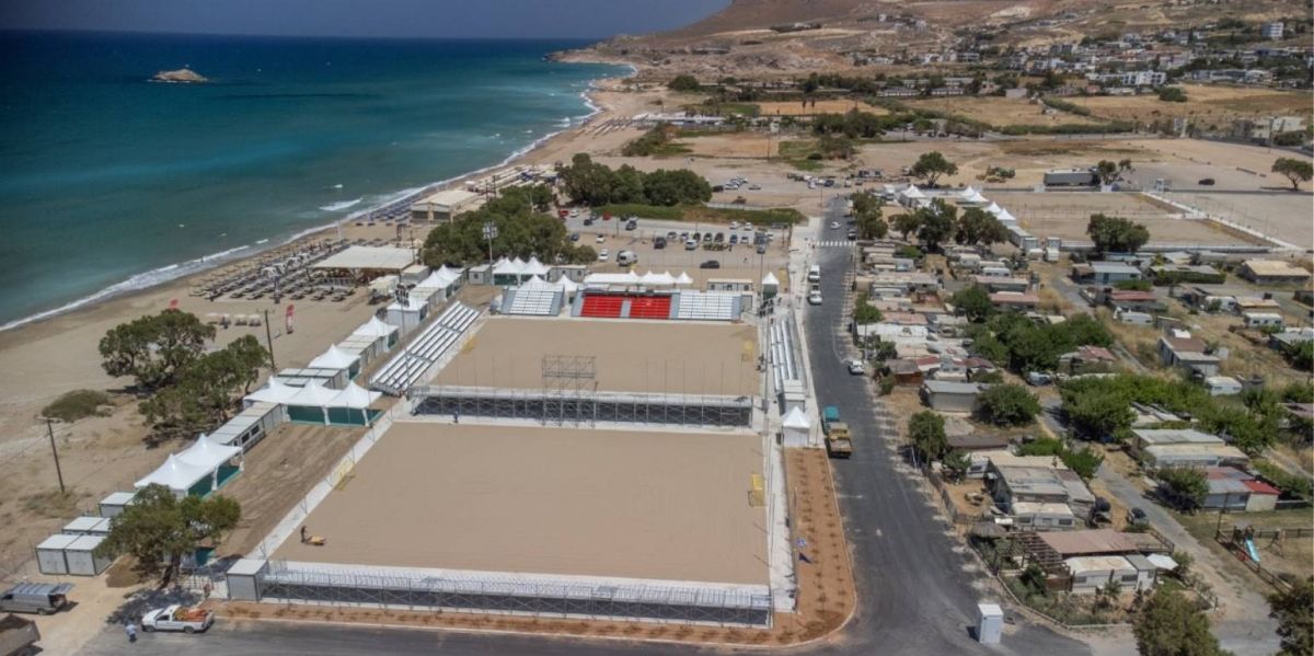 Η εγκατάσταση, που θα χτυπάει η καρδιά των Μεσογειακών Παράκτιων «Ηράκλειο 2023», περιλαμβάνει αυτή τη στιγμή τέσσερα σύγχρονα γήπεδα άμμου (ένα κεντρικό με λυόμενες περιμετρικές κερκίδες χωρητικότητας 2.500 θεατών, δύο επιπλέον χωρητικότητας 500 θεατών συν ένα βοηθητικό), καθώς και ένα προθερμαντήριο.