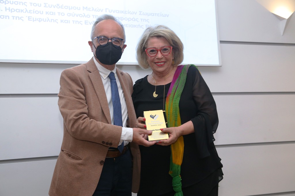 Τιμητικό βραβείο απονεμήθηκε στην πρόεδρο του «Συνδέσμου Μελών Γυναικείων Σωματείων Ηρακλείου & Ν. Ηρακλείου» κα. Μαίρη Παχιαδάκη για το σύνολο της προσφοράς της και στην αντιμετώπιση της έμφυλης και ενδοοικογενειακής βίας, την Τετάρτη 6 Ιουλίου στην τελετή απονομής των «Patient Partnerships Awards 2022» στην Αθήνα, με τη συμμετοχή σημαντικών εκπροσώπων του ακαδημαϊκού, επιστημονικού, επιχειρηματικού, θεσμικού και ευρύτερου κλάδου της Υγείας. Το τιμητικό βραβείο απονεμήθηκε κατόπιν πρότασης του προέδρου της φετινής Κριτικής Επιτροπής κ. Χρήστου Λιονή, καθηγητή Γενικής Ιατρικής και Α/θμιας Φροντίδας Υγείας της Ιατρικής Σχολής Πανεπιστημίου Κρήτης, μέλους της ομάδας εμπειρογνωμόνων για αποτελεσματικές επενδύσεις στον τομέα υγείας της Ευρωπαϊκής Επιτροπής.