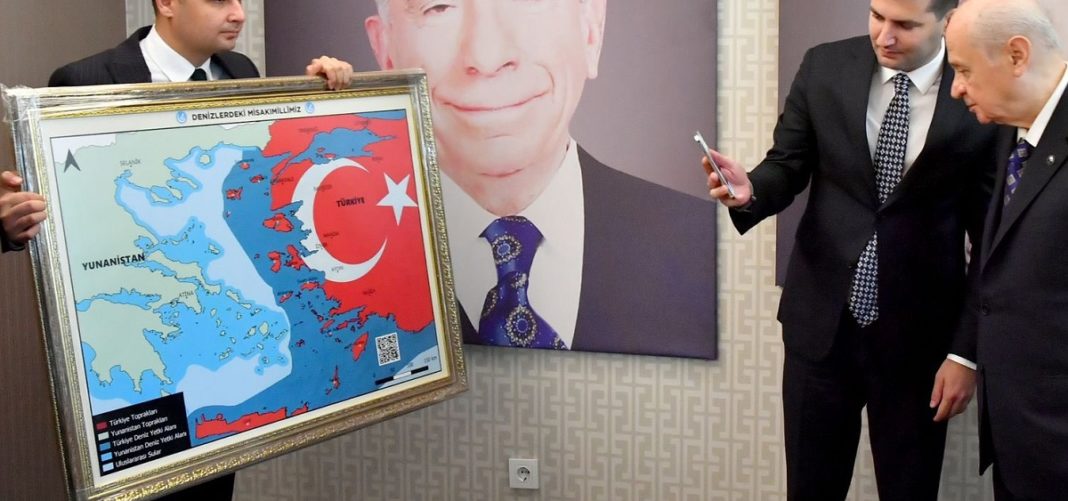Είμαστε υπερήφανοι που παρουσιάζουμε στον Αρχηγό μας Ντεβλέτ Μπαχτεσλί τον χάρτη μας, που ετοιμάσαμε με επίγνωση της σημασίας και της δύναμης της Γαλάζιας Πατρίδας, που σηματοδοτεί τη συνοριακή γραμμή μπροστά στην εθνική συνείδηση των νησιών μας, όπου η ένδοξη ημισέληνος και το αστέρι κυμάτισαν για αιώνες, αλλά άδικα έγινε αντικείμενο σφετερισμού από την Ελλάδα, που ονομάζονται «ΤΑ ΕΘΝΙΚΑ ΣΥΝΟΡΑ ΜΑΣ ΣΤΗ ΘΑΛΑΣΣΑ», ο οποίος χάρτης περιλαμβάνει το QR της ομιλίας του Αξιότιμου Αρχηγού μας Ντεβλέτ Μπαχτεσλί με θέμα τη Γαλάζια Πατρίδα και το Αιγαίο Πέλαγος.