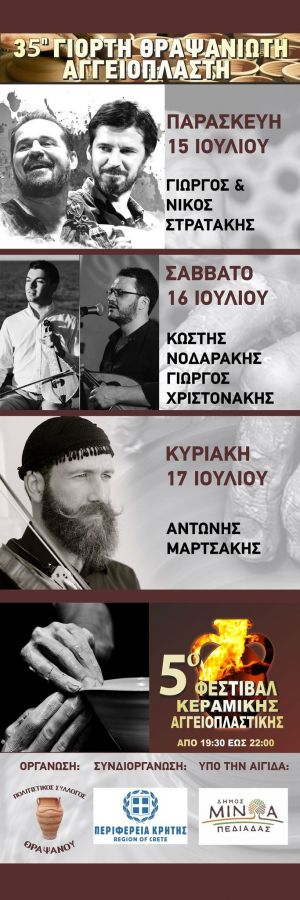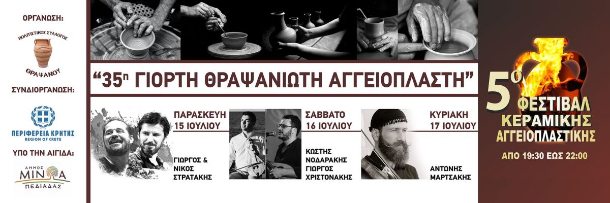 Ο πολιτιστικός σύλλογος Θραψανού οργανώνει την 35η γιορτή «Θραψανιώτη Αγγειοπλάστη» και το 5ο φεστιβάλ «Κεραμικής Αγγειοπλαστικής» με την στήριξη της Περιφέρειας Κρήτης. Το πρόγραμμα που ανακοίνωσε ο σύλλογος είναι: