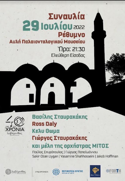 Στις 29 Ιουλίου στην αυλή του Παλαιοντολογικού Μουσείου στο Ρέθυμνο θα πραγματοποιηθεί συναυλία με τον Βασίλη Σταυρακάκη και τον Ross Daly. Συμμετέχουν οι μουσικοί Κέλυ Θωμά και Γιώργος Σταυρακάκης καθώς και τα μέλη της Ορχήστρας «Μίτος». Η συγκεκριμένη Ορχήστρα εμπλουτίζει τις μουσικές παραστάσεις καθιστώντας τις μια πραγματικά πλούσια εμπειρία για το κοινό.
