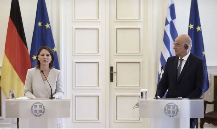 Tο ζήτημα γερμανικών αποζημιώσεων, αλλά και των εξαγωγών γερμανικών υποβρυχίων στην Τουρκία έθεσε ξεκάθαρα ο υπουργός Εξωτερικών Νίκος Δένδιας, κατά τη συνάντησή του με τη Γερμανίδα υπουργό Εξωτερικών Ανναλένα Μπέρμποκ, η οποία υπογράμμισε ότι η γερμανική κυβέρνηση «δεν θα επιτρέψει να υπάρξει καμία αμφιβολία ότι στεκόμαστε αλληλέγγυοι» στην Ελλάδα και ξεκαθάρισε ότι κανείς δεν έχει δικαίωμα να αμφισβητεί την κυριαρχία των ελληνικών νησιών.