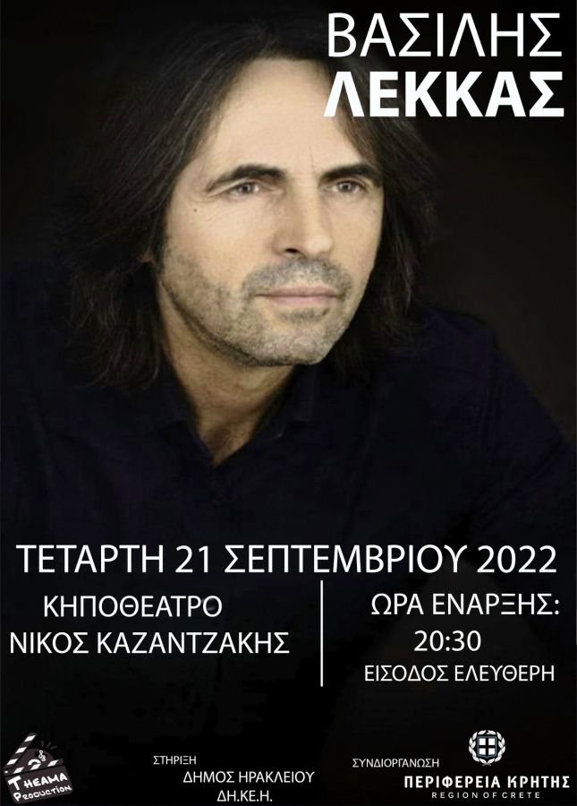 Τον Βασίλη Λέκκα, ερμηνευτή με ξεχωριστή παρουσία, υποδέχεται η Κρήτη σε μία μουσική παράσταση που θα πραγματοποιηθεί την Τετάρτη 21/09/2022 στο Κηποθέατρο «Νίκος Καζαντζάκης» στις 8:30 το βράδυ με την συνδιοργάνωση της Περιφέρειας Κρήτης και ελεύθερη είσοδο για το κοινό.