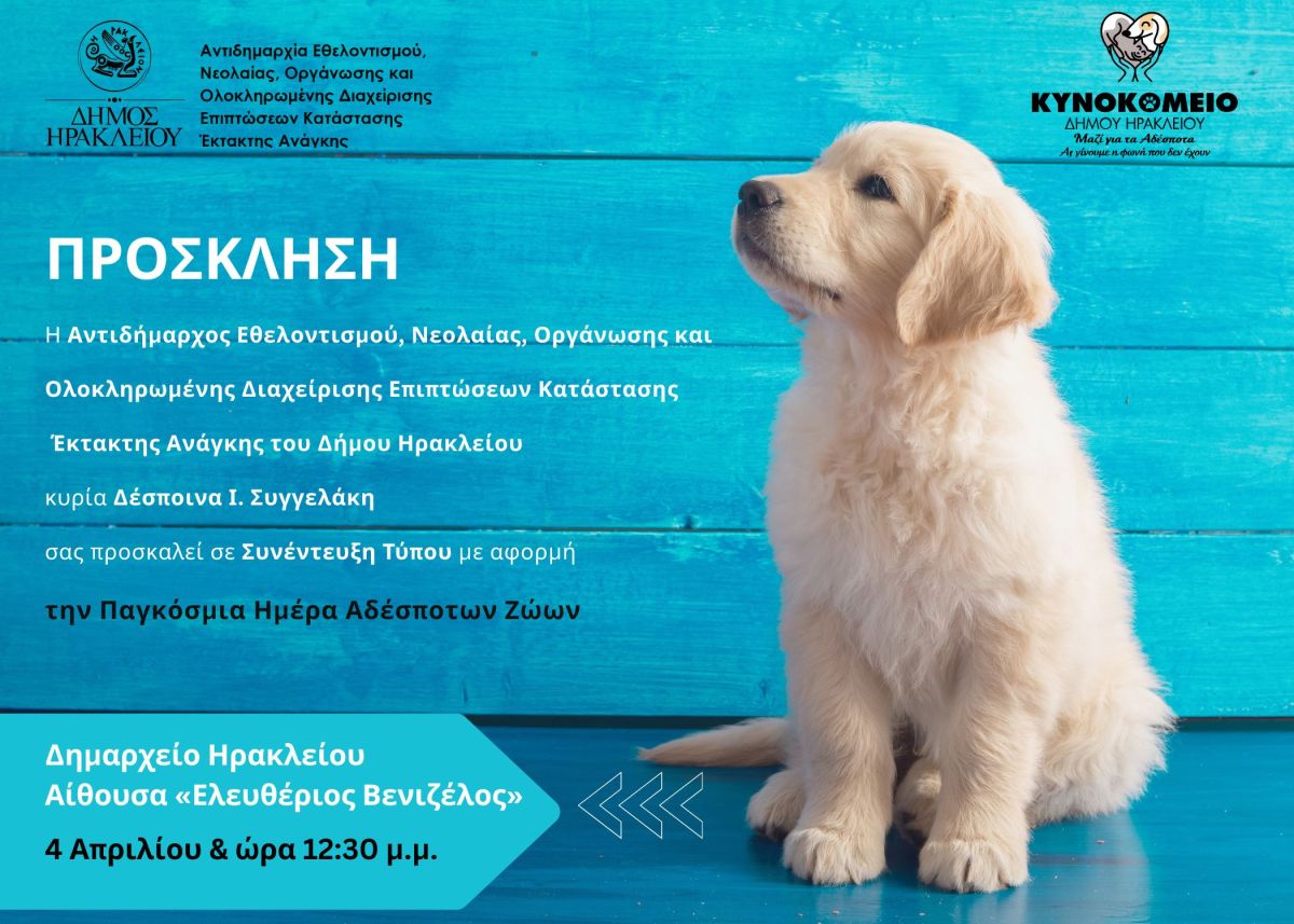 Με αφορμή την Παγκόσμια Ημέρα Αδέσποτων Ζώων ο Δήμος Ηρακλείου/Αντιδημαρχία Εθελοντισμού, Νεολαίας, Οργάνωσης και Ολοκληρωμένης Διαχείρισης Επιπτώσεων Έκτακτης ανάγκης διοργανώνει συνέντευξή τύπου την Τρίτη 4 Απριλίου 2023, στις 12.30 στην αίθουσα «Ελευθέριος Βενιζέλος» στη Λότζια, προκειμένου να γίνει ενημέρωση σχετικά με τις ενέργειες του Δήμου Ηρακλείου για το μεγάλο αυτό ζήτημα.