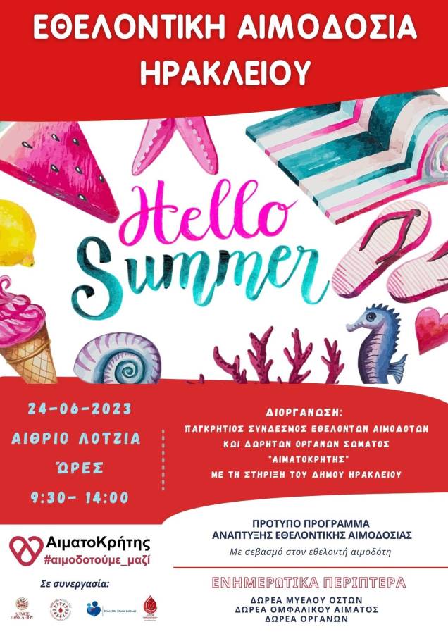 Εθελοντική αιμοδοσία θα πραγματοποιηθεί το Σάββατο 24/06/2023 στο κέντρο της πόλης του Ηρακλείου και συγκεκριμένα στο αίθριο της Λότζια από τις 9:30 έως τις 14:00.