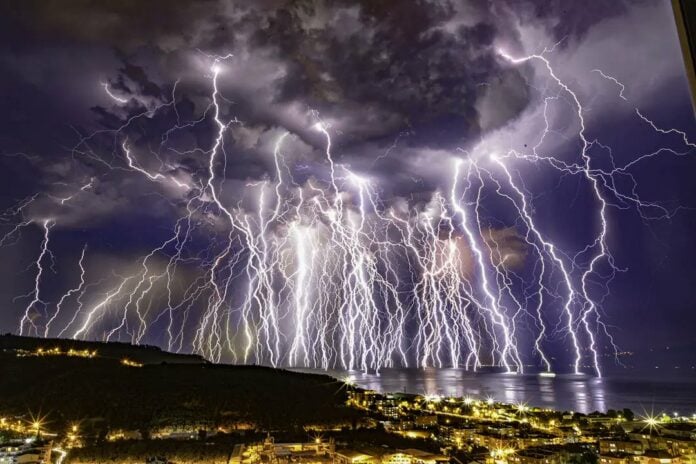 Στη φωτογραφία εικονίζονται τρεις τύποι κεραυνών. Κεραυνοί που ξεκινούν από ένα σύννεφο και καταλήγουν σε ένα άλλο σύννεφο, κεραυνοί που χτυπούν τη στεριά και κεραυνοί που καταλήγουν στη θάλασσα σε ένα πραγματικό… ηλεκτρικό σόου. Υπολογίζεται ότι κάθε μέρα κάνουν την εμφάνιση τους στη Γη περίπου τρία εκατ. κεραυνοί και συνολικά 1,4 δισ. κεραυνοί ετησίως. Κάθε κεραυνός έχει ισχύ από 100 εκατομμύρια ως ένα δισ. βολτ και η θερμοκρασία στο σημείο στο οποίο πέφτει κυμαίνεται από 10-33 χιλιάδες βαθμούς Κελσίου.