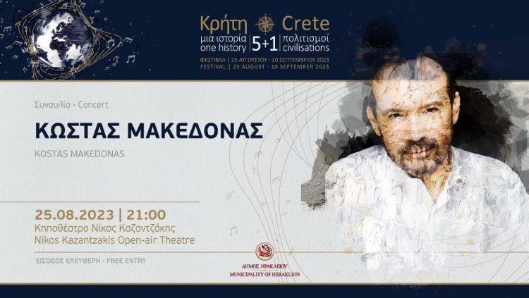 Με την συναυλία του γνωστού μουσικού Κώστα Μακεδόνα ξεκινά την Παρασκευή 25 Αυγούστου το Φεστιβάλ του Δήμου Ηρακλείου «Κρήτη μια Ιστορία, 5+1 Πολιτισμοί», που διοργανώνεται για 9η συνεχή χρονιά. Ο Κώστας Μακεδόνας, από τους σημαντικότερους ερμηνευτές της γενιάς του, δεν χρειάζεται ιδιαίτερες συστάσεις, ούτε άλλωστε οι μουσικοί που τον συνοδεύουν.