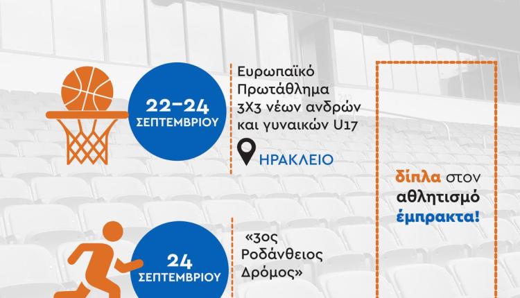 Σημαντικές διοργανώσεις πραγματοποιούνται τις προσεχείς ημέρες στην Κρήτη, με την στήριξη της Περιφέρειας Κρήτης. Από την Παρασκευή 22 έως και την Κυριακή 24 Σεπτεμβρίου θα πραγματοποιηθεί στο Ηράκλειο το Ευρωπαϊκό Πρωτάθλημα 3Χ3 νέων ανδρών και γυναικών U17. Επίσης την Κυριακή 24 Σεπτεμβρίου θα πραγματοποιηθεί στο Ηράκλειο ο «3ος Ροδάνθειος Δρόμος».